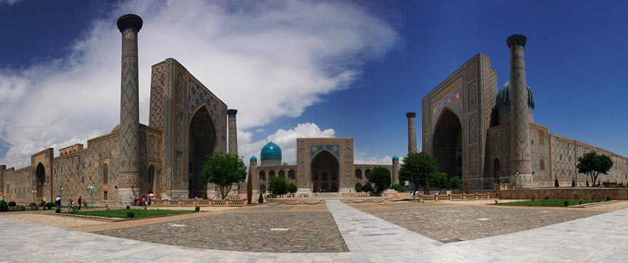 Registan Square was for many centuries, and remains, the center of Samarkand. Many centuries ago, Small River crossed the square where the first madrassa was constructed. Years passed and the river dried up leaving only the sand in the riverbed. Registan means “the sandy spot.” In the 15th century the first madrassa was founded here. Beginning from that time, all celebrations, festivals, and Sunday bazaars have taken place in Registan square.